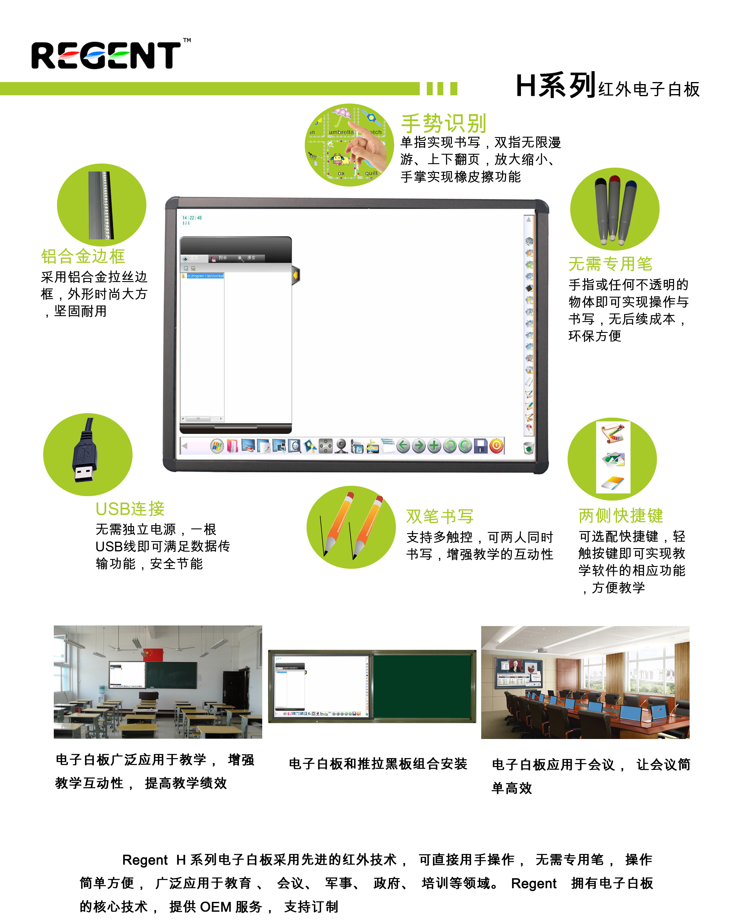 交互式电子白板是一个大型互动演示器连接到电脑和投影仪。一台投影机把计算机的桌面投射板表面,在那里用户可以用钢笔或手指写。白板通常安装在墙上或架子上采用红外线技术,使手指,手或任何其他不透明的物体直接接触控制电脑而不需要使用专用笔。IWB用于教育,会议,演讲和其他应用程序。这是易于多功能使用;IWB实现与用户之间的互动的目的,给学生一个生动的感官体验,音乐,声音,图像,动画,鼓励学生参与,同时也激发了教师。交互式电子白板是实现二十一世纪一体化教室一个重要成分,我们有多种尺寸以满足您的不同要求,我们的研发部门很高兴听到客户的构思,或进行密切合作,把他们的想法变成现实。